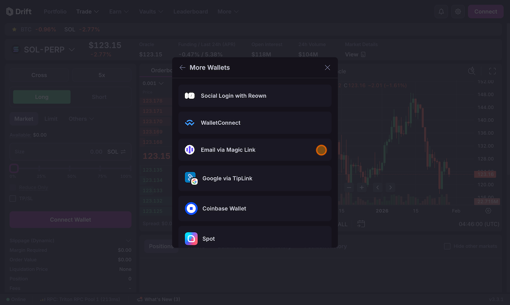 You can get started on Drift quickly and securely without any passwords or seed phrases to access your account or funds.